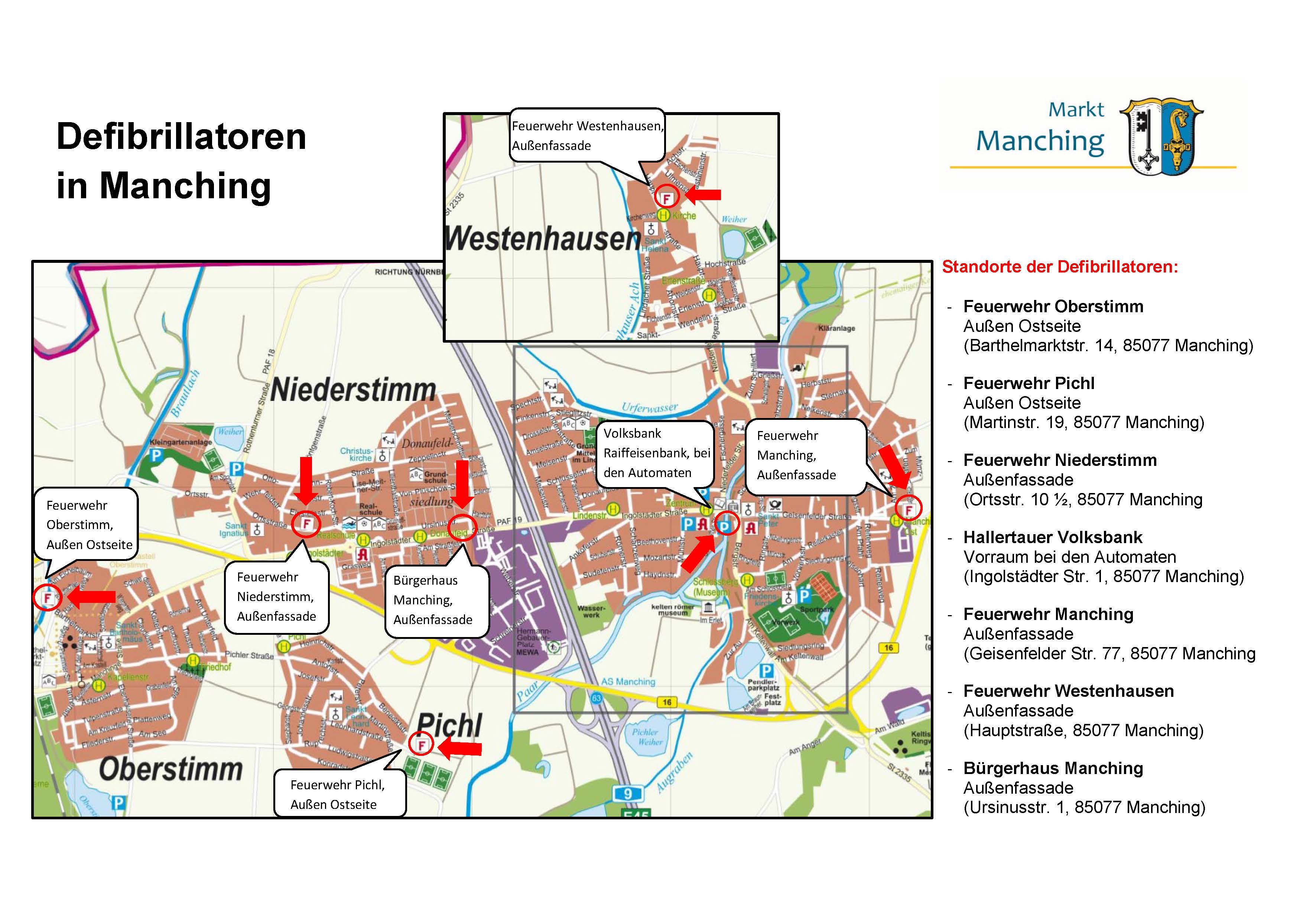 Um eine solche medizinische Ersthilfe ermöglichen zu können, finden Sie hier eine Auflistung der Standorte mit Defibrillator im Gemeindegebiet Manching. Diese wurden vom Erlös der vergangenen Entenrennen (Unabhängige Wähler) und durch großzügige Spenden lokaler Unternehmen, Vereine usw. gespendet bzw. bereitgestellt.