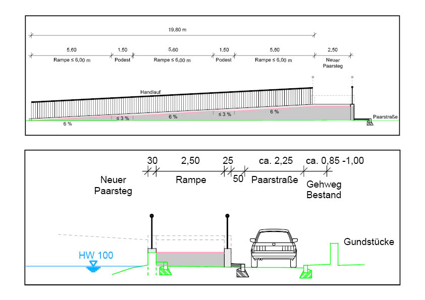 Aus Sicht der Verwaltung ist diese Variante nicht umsetzbar. Bei einem Steg auf eine abknickende Rampe mit der von der IG vorgeschlagenen Breite von 1,5 m kommt man weder mit dem Fahrrad noch mit einem Fahrrad mit Kinderanhänger bzw. mit einem Elektromobil für Senioren ohne rangieren zu müssen vernünftig um die Kurve.