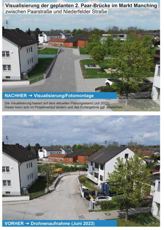 Der Bau einer zweiten Brücke über die Paar im Ortskern von Manching ist beschlossene Sache. Der Gemeinderat hat in der öffentlichen Sitzung vom 27. April 2023 mit 18 dafür und 4 Gegenstimmen für die europaweite Ausschreibung der Brückenplanung gestimmt und hat diese Planungsleistungen in der Sitzung vom 20. Juli 2023 mit großer Mehrheit rechtsverbindlich beauftragt.