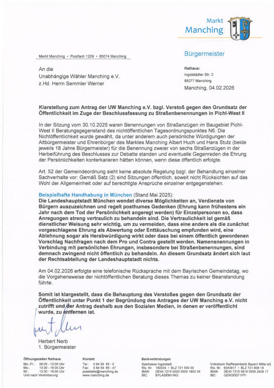 Klarstellung zum Antrag der UW Manching e.V. bzgl. Verstoß gegen den Grundsatz der Öffentlichkeit im Zuge der Beschlussfassung zu Straßenbenennungen in Pichl-West II