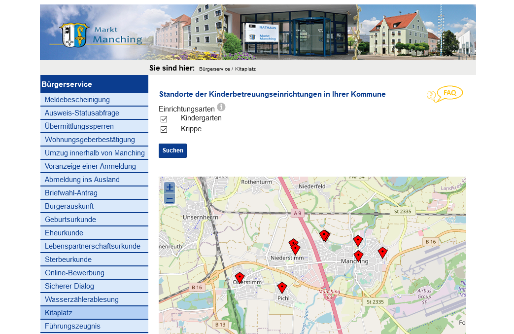 „Wir haben nach einem für die Eltern und unser KiTa-Personal gleichermaßen einfach zu bedienenden System für die Online-Anmeldung gesucht und sind letztendlich fündig geworden. Um keinen Schnellschuss zu wagen, haben wir den Anmeldestart in Absprache mit allen Kindertageseinrichtungen in Manching auf April festgelegt“, so Manchings Erster Bürgermeister Herbert Nerb. Während des Anmeldevorgangs werden die gängigsten Fragen von Eltern bereits beantwortet. Wer Hilfe benötigt, kann sich auf den Hilfe-Seiten informieren. Hier stehen auch Informationen zu den Platz-Vergabekriterien.